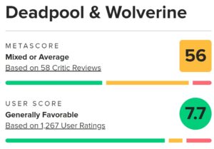 映画『デッドプール & ウルヴァリン』に対する批評家と観客の評価には、明確な違いが見られます。メタスコアは56点とやや低めで、批評家からは物語の構成やプロットの浅さ、過剰なファンサービスに対して厳しい評価が目立ちます。一方、ユーザースコアは7.5点と比較的高く、多くの観客が映画のエンターテインメント性を楽しんでいます。